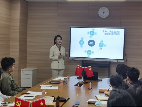 接下来,新励成言光负责人肖哲蓉对新励成的品牌进行了简要介绍,她指出,新励成是面向成人和大学生的以口才培训为主的软实力培训教育品牌,就业指导服务是其精品课程之一。然后,新励成集团老师陈晶洁对新励成集团的精品课程、主题比赛、实践活动等进行了详细介绍,展现了以课程实践为主、结合理论技巧的多元化的教学方式。她指出,高校的课程和培训机构的课程都有各自擅长的优势,通过校企合作,双方都能够获得新灵感和新思路。接着,新励成集团老师靳铃培围绕软实力课程、实践行动、实战机会和校园赛事四方面,对新励成集团的软实力课程体系进行了详细介绍,并阐述其注重实践、精准、科学、有效及有趣的教学特色。