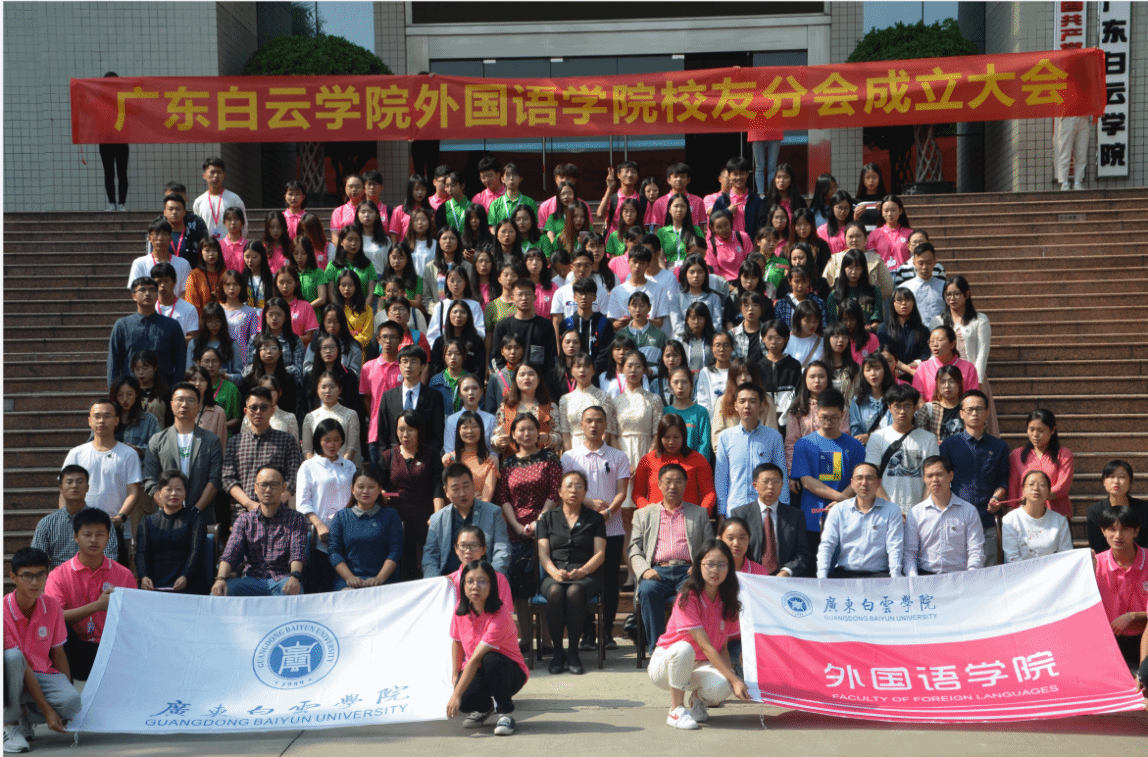 广东白云学院外国语学院校友分会成立于2019年11月17日,由外国语学院院长何高大任会长。校友会成员由曾在外国语学院学习过的学生及工作过的教职工以自愿入会的方式组成。经过3年努力,现已发展成为受到广大校友关注,具有较大影响力和凝聚力的校友会组织。外国语学院校友会致力于通过承办或开展系列旨在密切校友与学院、校友与在校学生、校友与校友间联系的活动,搭建有助于学院发展、校友事业发展和学生成长的平台。