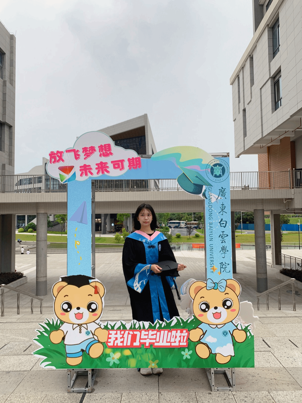 吴慧怡,广东白云学院 2023 届英语专业毕业生,现任阳山县青莲镇人民政府基层公务员。在校期间,她勤奋笃学,考取英语专四、大学英语四级证书,积极参与学科竞赛与校园工作,曾任定向越野协会策划部部长,带领社团荣获 “凤凰花” 最受欢迎社团奖。毕业后扎根基层一线,主要负责档案管理、公文撰写、会务保障等工作,主动投身防火防汛等应急任务,在平凡岗位上履职尽责、服务群众,以实际行动展现白云学子的责任与担当。